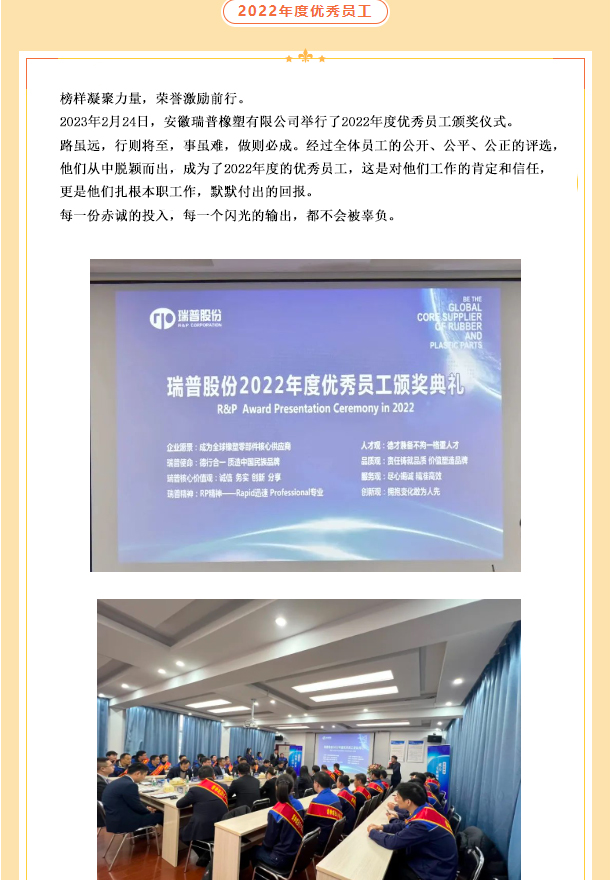 董事長對(duì)各部門、子公司負(fù)責(zé)人的2022年度總結(jié)及2023年度工作規(guī)劃進(jìn)行分析,對(duì)大家疫情期間的工作予以肯定,并對(duì)其薄弱與不足之處提出改進(jìn)意見。2023年公司將圍繞開拓新市場、項(xiàng)目管理制度、事業(yè)部智能化制造、員工工作能力、公司管理制度等方面進(jìn)行提升。努力為員工提供更好的福利待遇,為客戶提供更優(yōu)質(zhì)的服務(wù),為實(shí)現(xiàn)瑞普成為全球橡塑零部件核心供應(yīng)商的企業(yè)愿景而不懈努力!